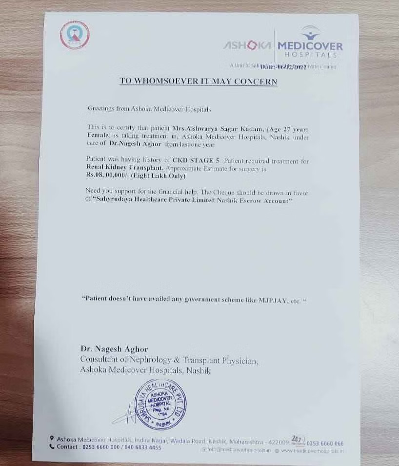 My name is laxmikant pimple and I am raising funds for my daughter, aishwarya kadam who is suffering from Kidney (renal) Failure and is undergoing treatment at Ashoka Medicover Hospital, Nashik . The family has done all it can to collect the total amount required for the treatment but Rs.800000 more is required to pay for all the medical expenses.